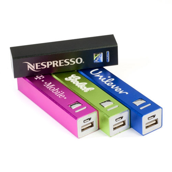 Make a secure connection with your tech-obsessed customers and supporters with this handy Powerbank. This 3 11/16" x 13/16" aluminum device has a rectangular design that packs a big 2200mAh in charging capacity. Includes a USB cord for quick and easy charges. Lithium ion battery. LED indicator light lets you know it's working. Up to 500 recharges from each device. 5V/1A output. UL listed. Choose from four colors and add your school, sports team, organizational or company logo or message to customize.