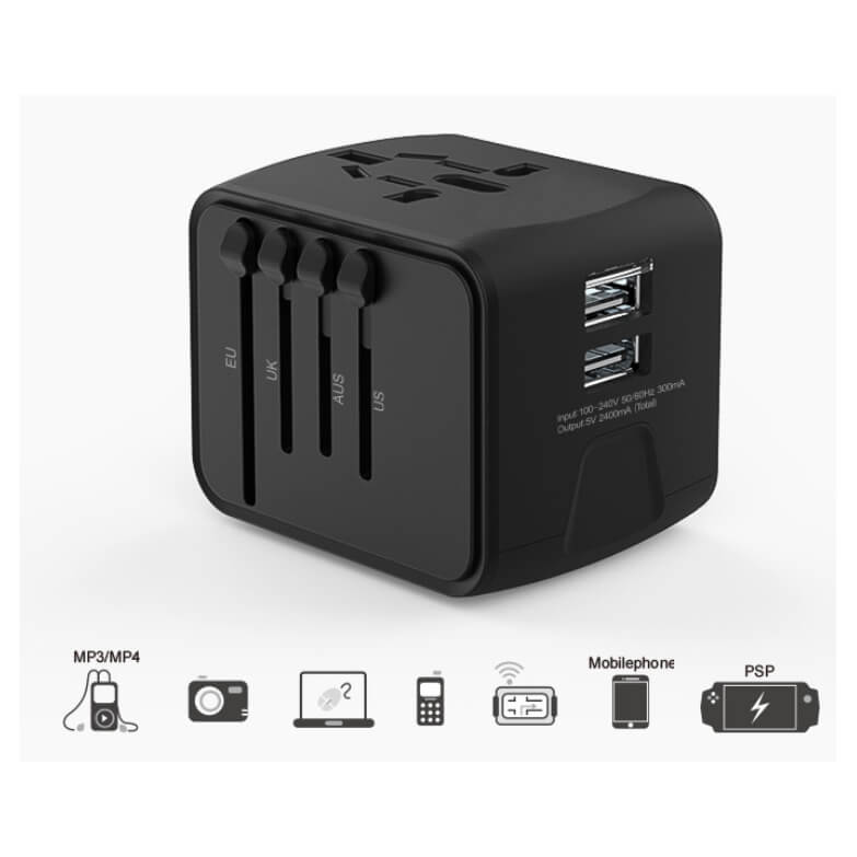 All in One Travel Plug Adapter covers 4 types of plugs, 3 USB ports, 1 USB Type-C port and 1 AC Outlet. Smart USB ports high speed, each 2.4A and C port 3A/ total 4.5A MAX. Charge up to 5 devices at the same time, which the ports automatically adapting the output for each one accordingly.