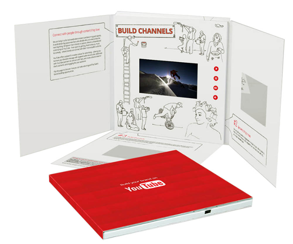 Video Brochures are superb for presentations, invites, PR, direct marketing, advertising and promotions. The Video Brochure creates a memorable impression of your promotion.When you hand someone one of our Video Brochures – it has an immediate impact. People are instantly drawn to your video content – users/clients are presented with a multi-sensory experience, which is instantly engaging, and far more impressive than a standard brochure. People will leave with a positive impression of your brand.
